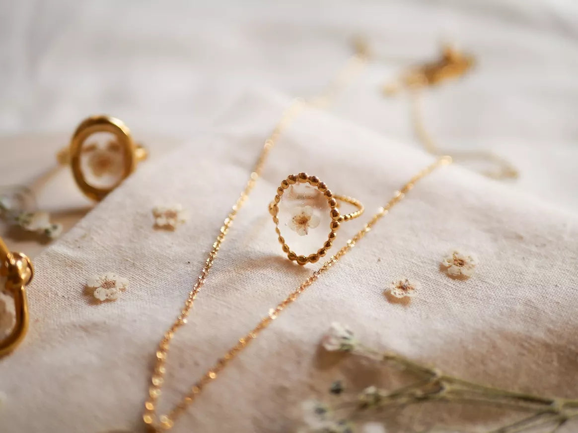 Une bague unique en acier inoxydable avec une petite fleur séchée piégée dans une résine.