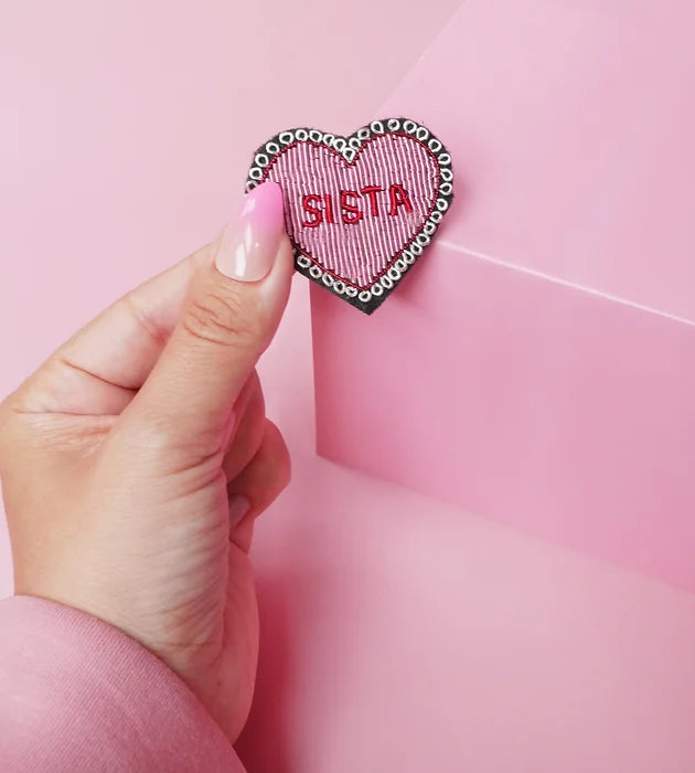 Broche motif coeur festons et détails dorés avec inscription "Sista"