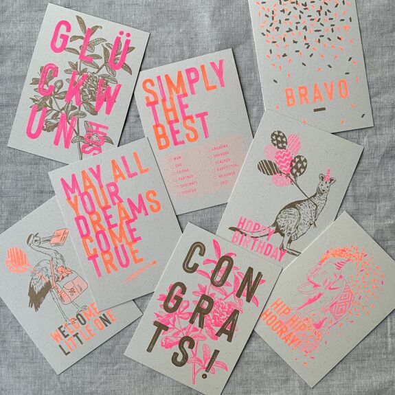 Chaque carte est unique et vit des traits artistiques de la risographie. Imprimé à Berlin avec de l'encre végétale sur du papier non couché trié sur le volet, fabriqué à partir de résidus de cultures agricoles.