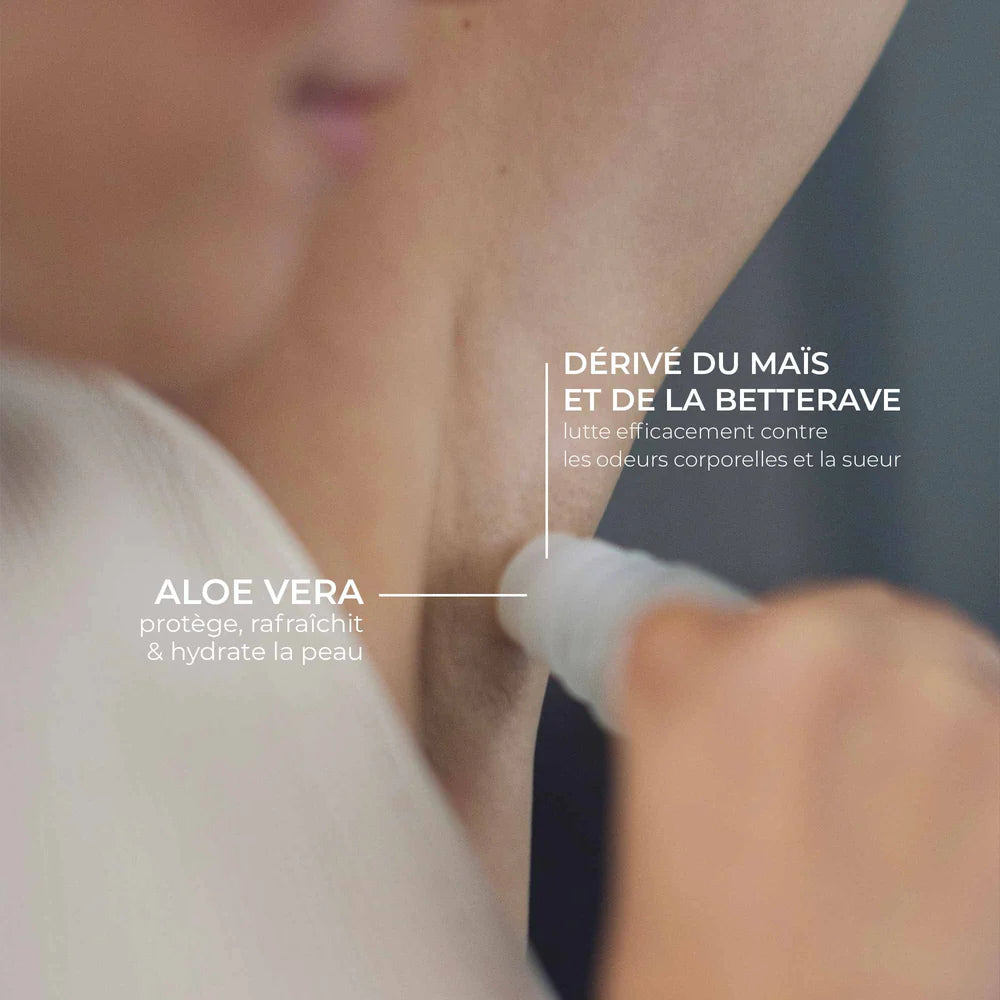 Votre peau sera hydratée et nourrie grâce à l'Aloe Vera bio et à l'huile de tournesol bio. Pour lutter contre les odeurs corporelles, il contient des actifs efficaces, dérivés du maïs et de la betterave.