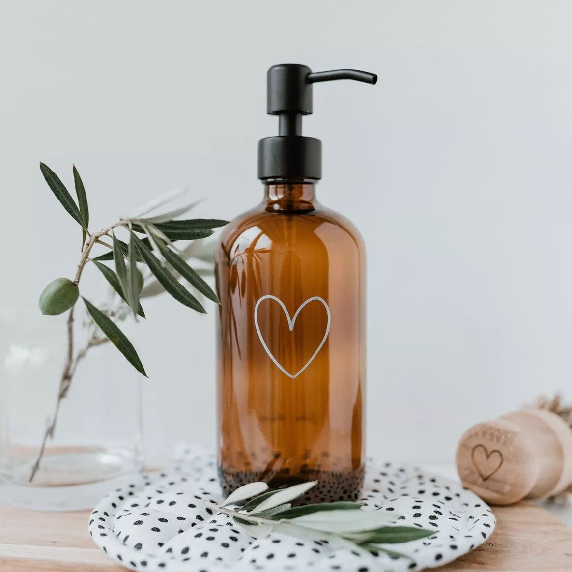 Découvrez nos nouveaux distributeurs de savon, comme le distributeur de savon coeur en verre ambré avec une pompe en métal !