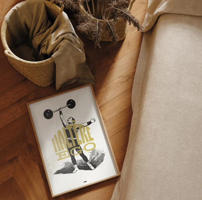Donnez une touche de caractère à votre déco avec l’affiche “Haltère Ego”, une création originale qui mêle humour, esprit vintage et typographie audacieuse. Cette illustration d’un haltérophile rétro en pleine démonstration de force est détournée par un jeu de mots savoureux. Une façon maligne et stylée d’exprimer votre goût pour le second degré et le culturisme.