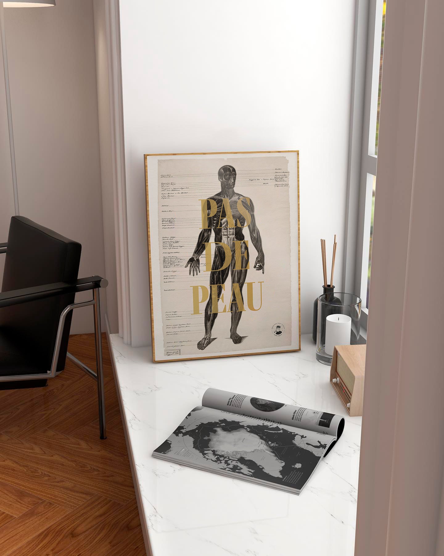 Cette affiche anatomique ne laissera personne indiffĂ©rent. Mettant en vedette un visuel dâĂ©corchĂ© ancien, ce dĂ©tournement artistique allie lâesthĂ©tique anatomique Ă un calembour (presque) raffinĂ©.