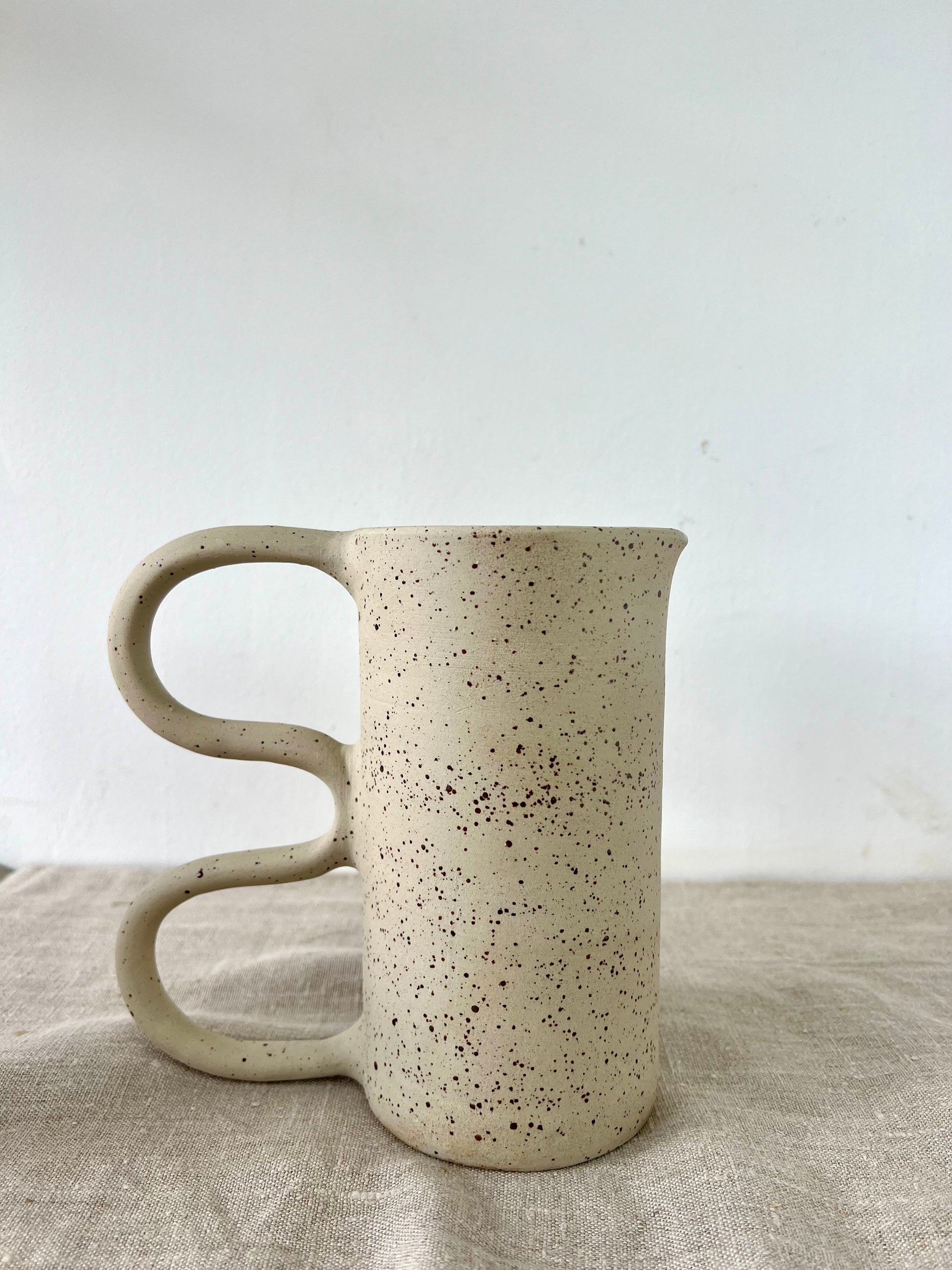 Technique et fabrication : pichet réalisé au tournage en grès blanc pyrité qui donne cet effet moucheté. Il est émaillé à l'intérieur et brut à l'extérieur. La pause de l'anse est particulièrement technique.