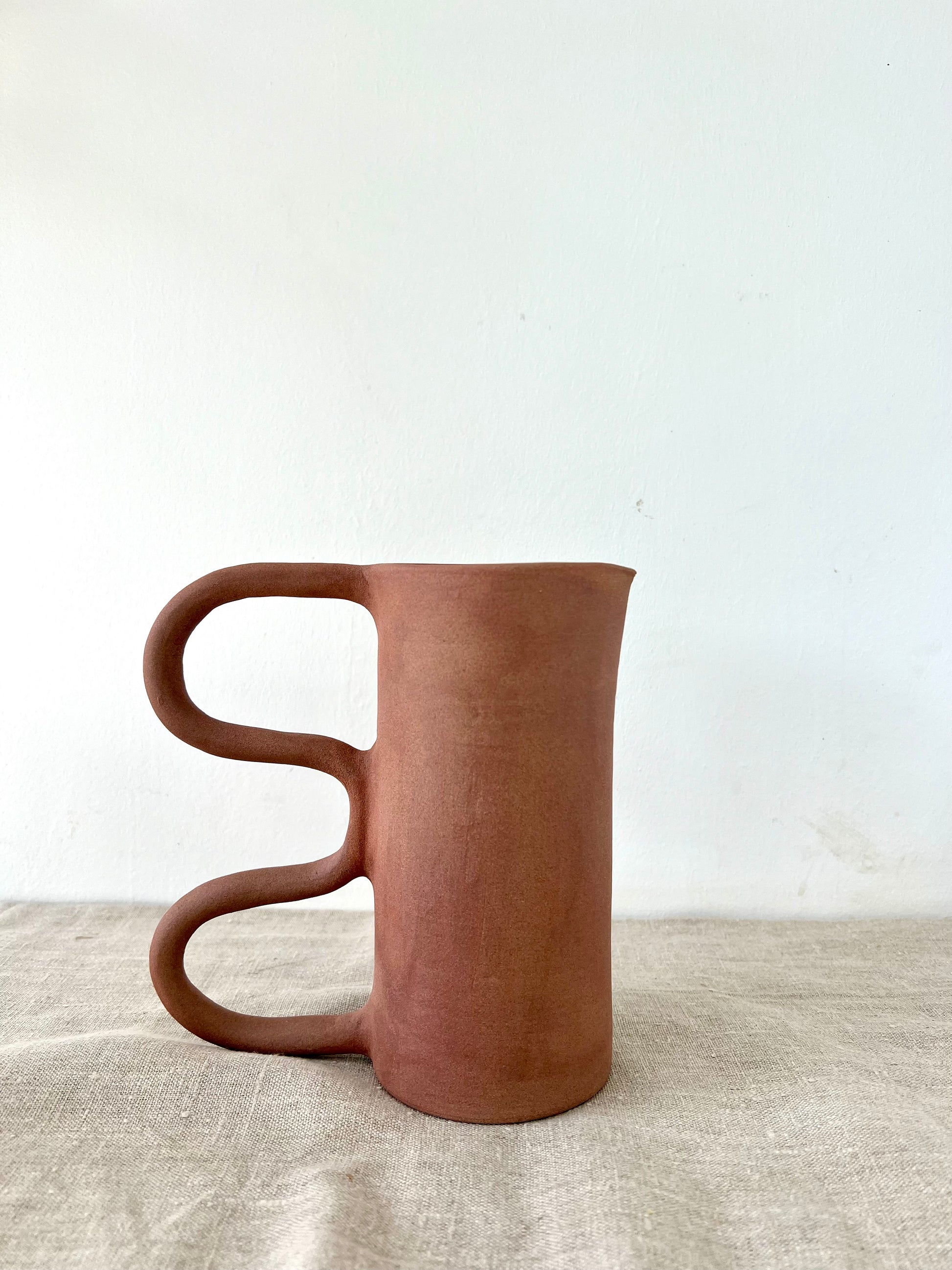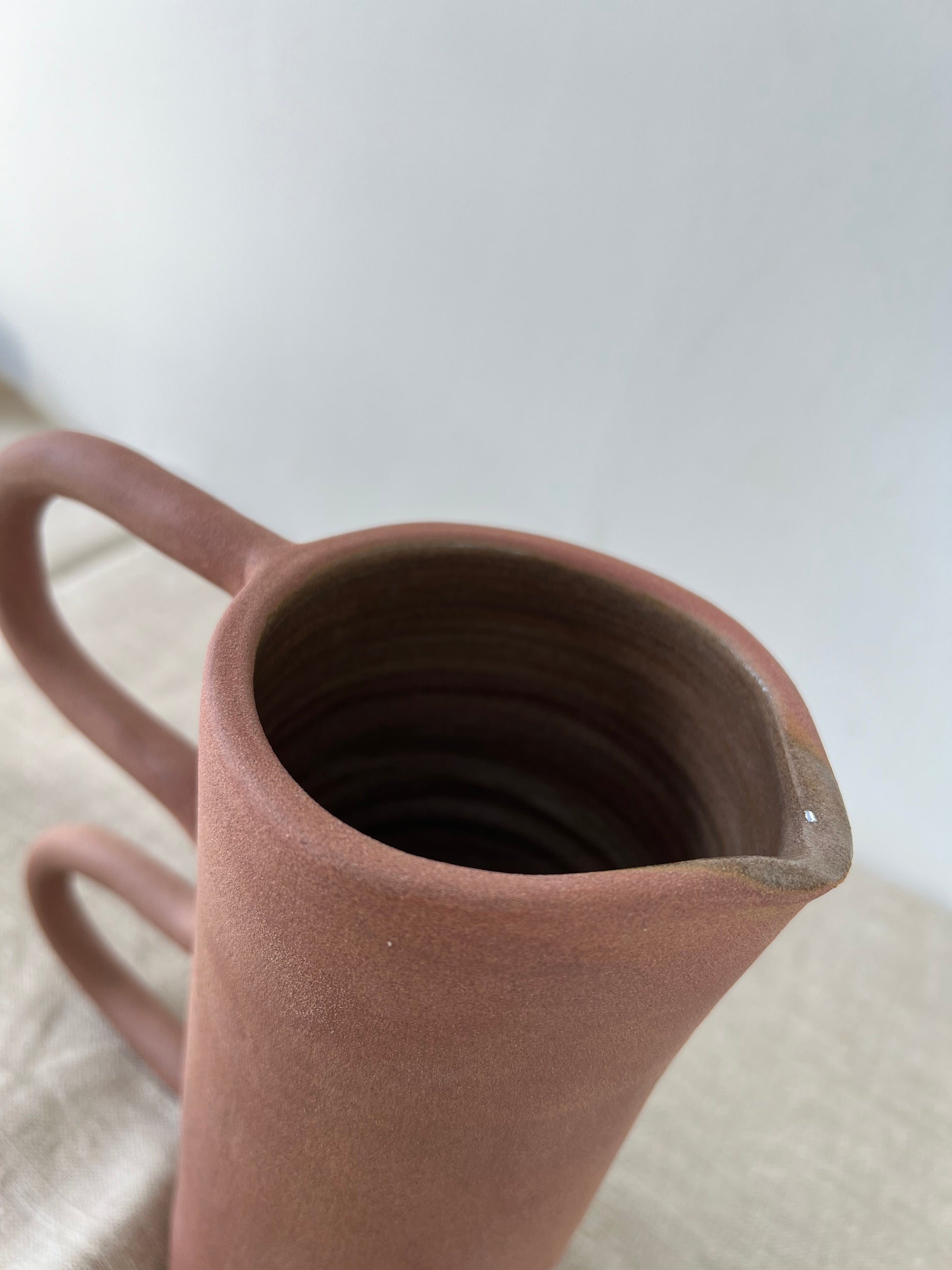 Technique et fabrication : pichet réalisé au tournage en grès roux rosé. Il est émaillé à l'intérieur et brut à l'extérieur. La pause de l'anse est particulièrement technique.