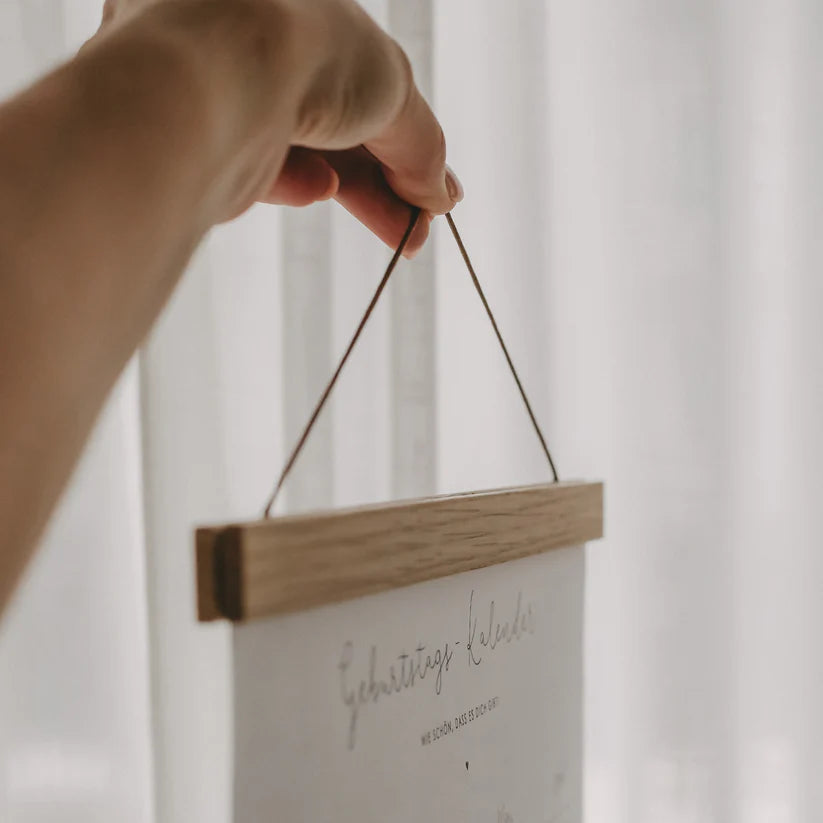 Une alternative élégante et magnifique aux cadres photo en aluminium est notre barre d'affiche magnétique A4 en chêne. Grâce aux aimants, les porte-affiches maintiennent le contenu, par exemple les affiches, les photos ou les calendriers, en toute fiabilité. Il est donc possible de les remplacer rapidement, au gré de ses envies. Un cordon de suspension est déjà intégré dans la barre supérieure. Tu recevras au total une partie supérieure et une partie inférieure, chacune composée de deux éléments magnétiques en chêne qui maintiennent ton papier ensemble sur le dessus et le dessous. D'une longueur de 21,5 cm pour les A4 et 31cm pour les A3.