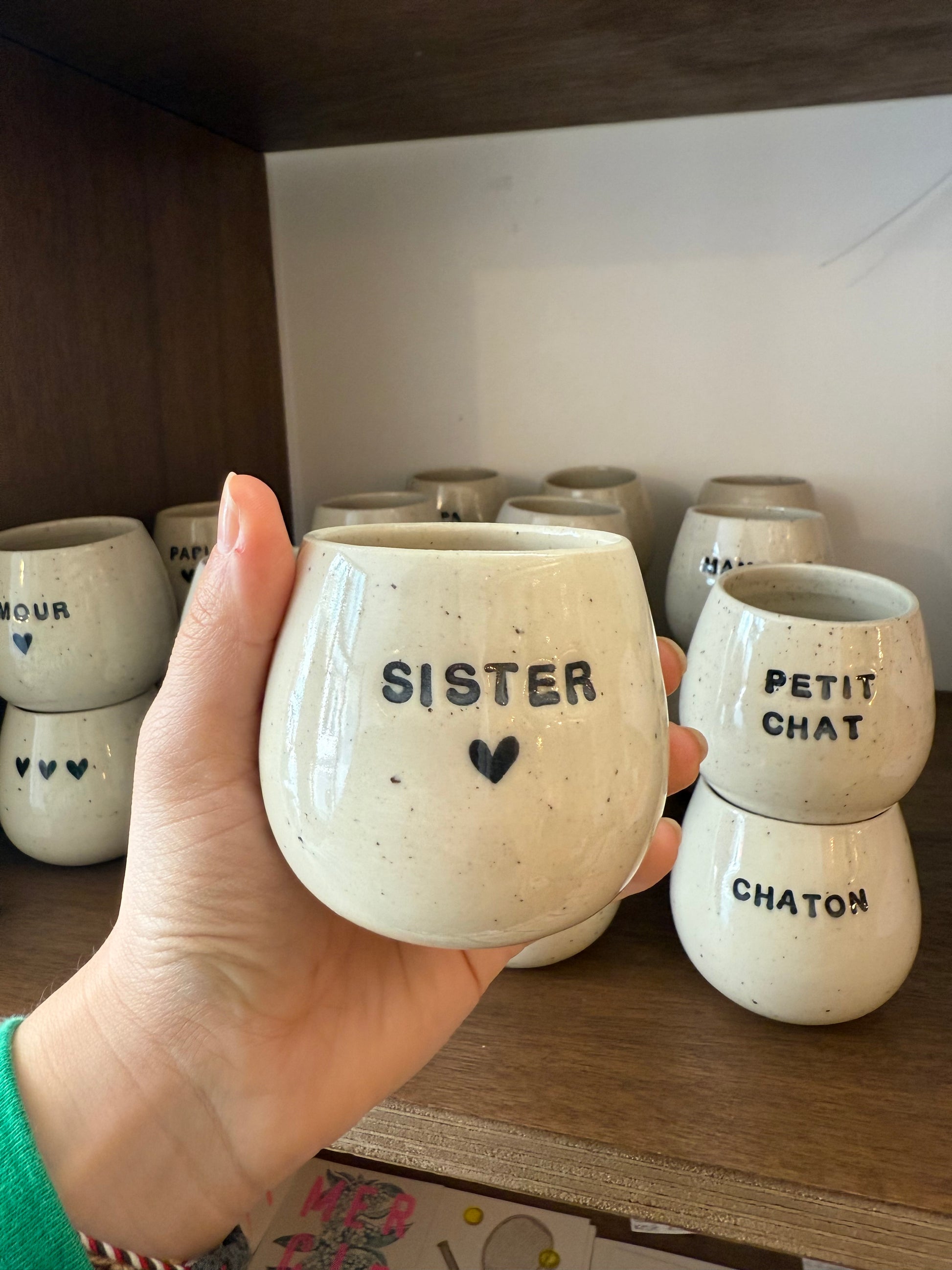 Tasse à café en grès blanc moucheté tournée et décorée à la main d’une délicate écriture